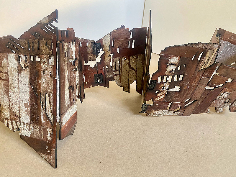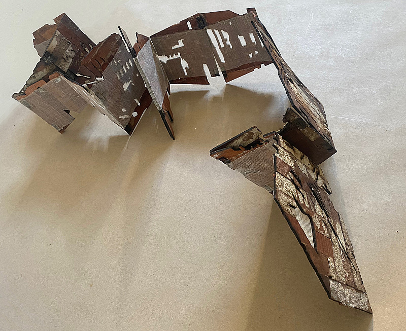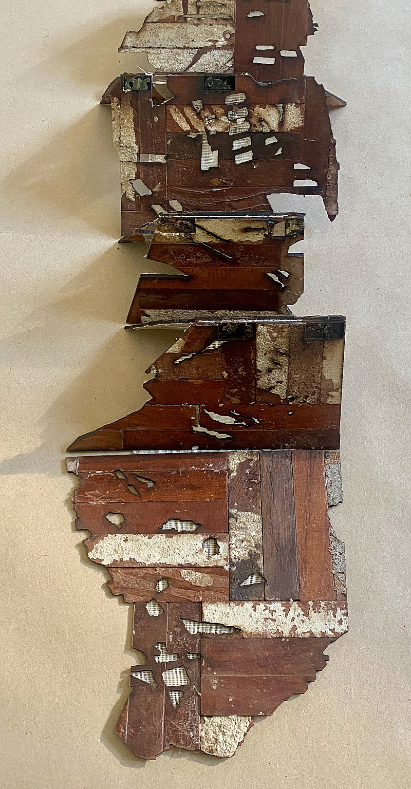 Laser-cut into discarded parquet floor blocks, scrim