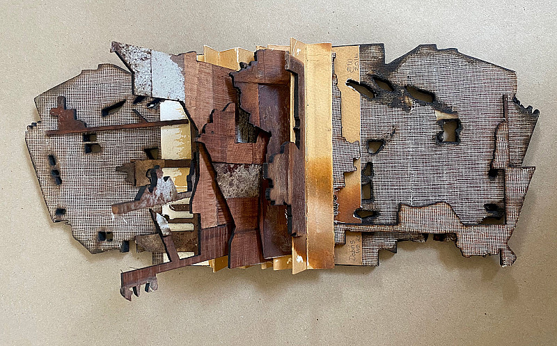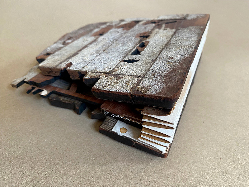 , Emma Willemse , Discarded parquet floor blocks, scrim, paper, inks