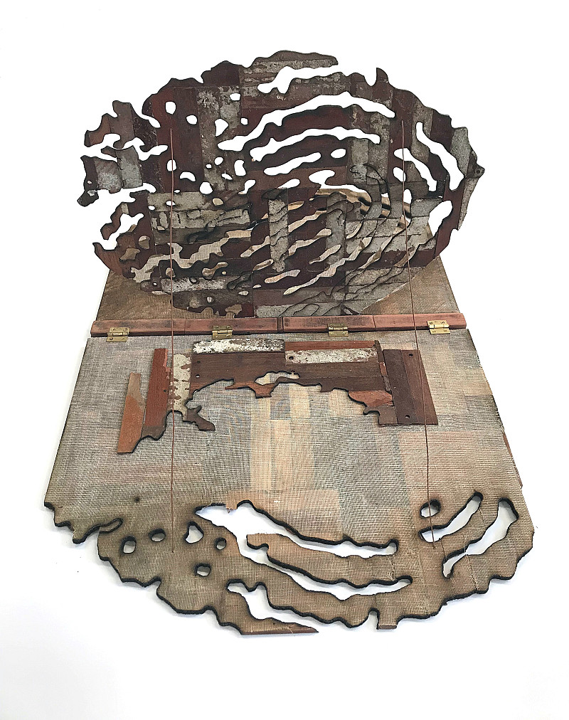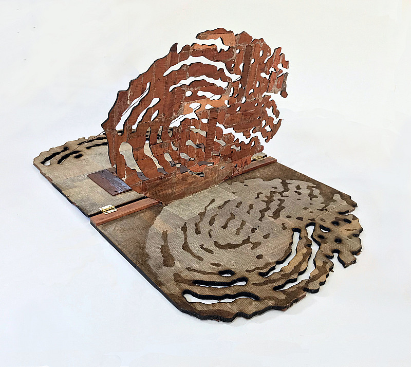 Discarded parquet floor blocks, scrim, metal hinges, cotton string, inks