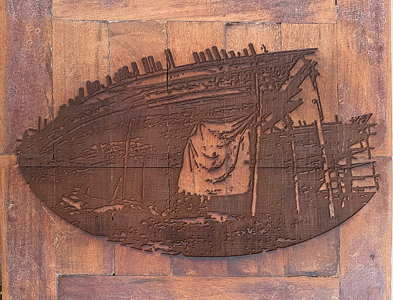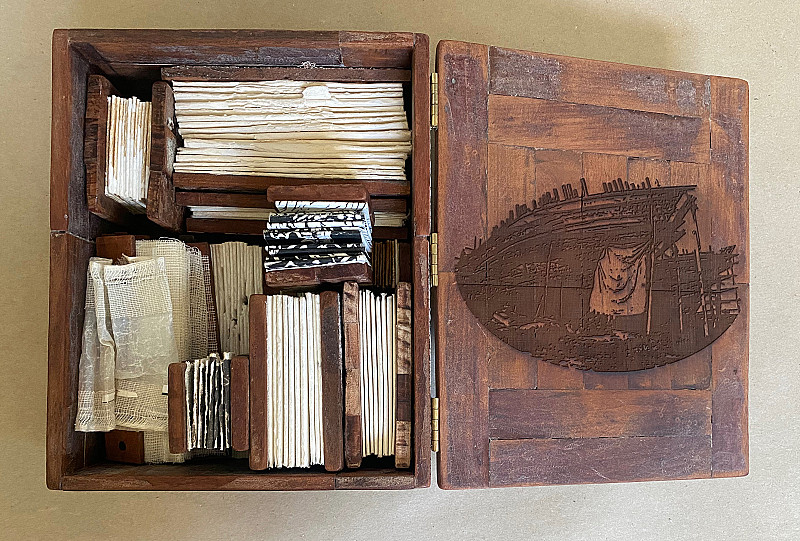 , Emma Willemse , Container: Discarded parquet floor blocks, laser engraving, steel hinges. Inner: mixed media