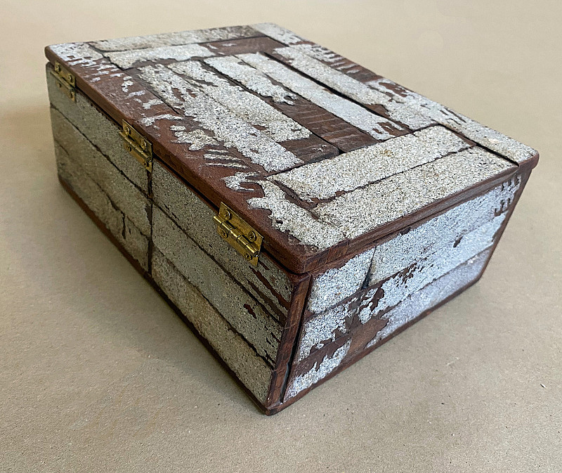 Container: Discarded parquet floor blocks, laser engraving, steel hinges. Inner: mixed media